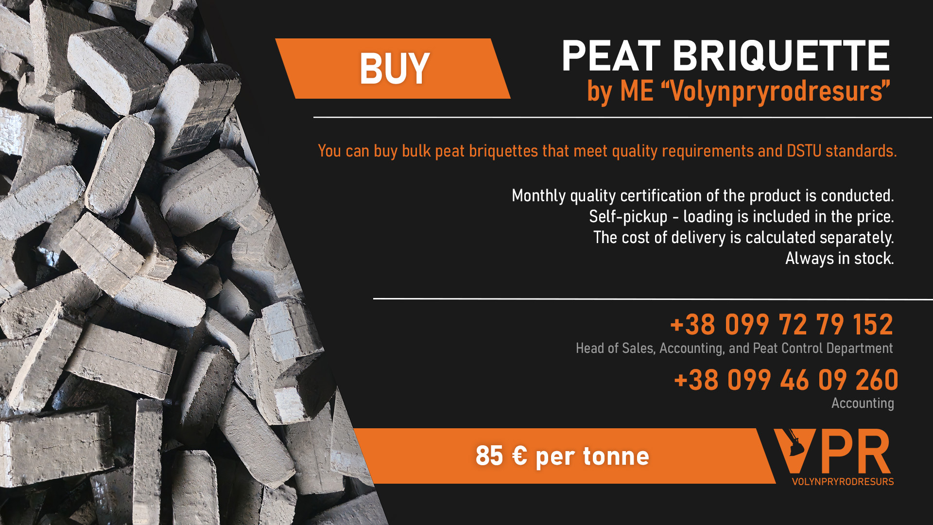 Call and order bulk peat briquettes from us—products of VPR are well-known throughout Ukraine.