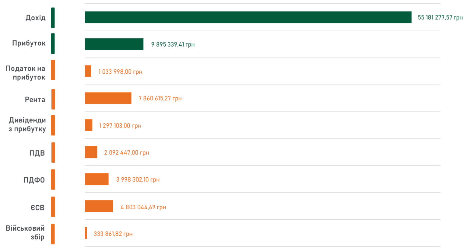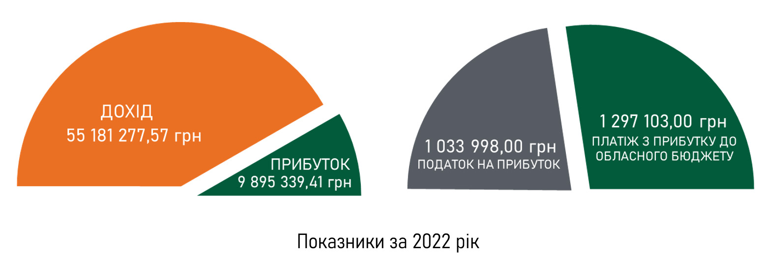 For 2022, based on quarterly financial and economic performance, 1,297,103 UAH was paid to the general fund of the Volyn Regional Budget from a 15% share of net profit.