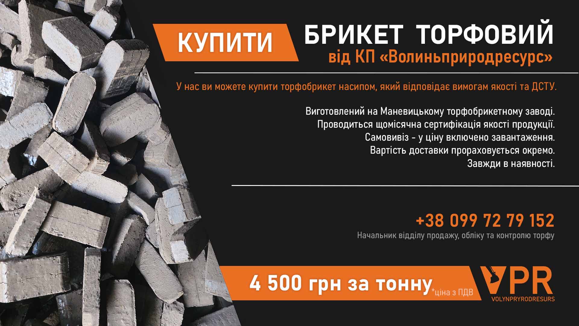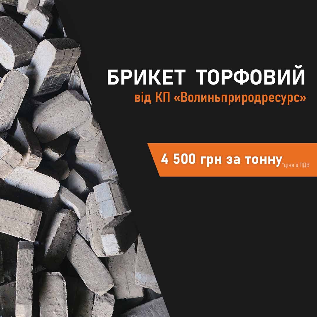 КП «Волиньприродресурс» пропонує купити торф’яні брикети насипом за ціною – 4500 грн за тонну (з ПДВ) з завантаженням на автомобіль покупця.