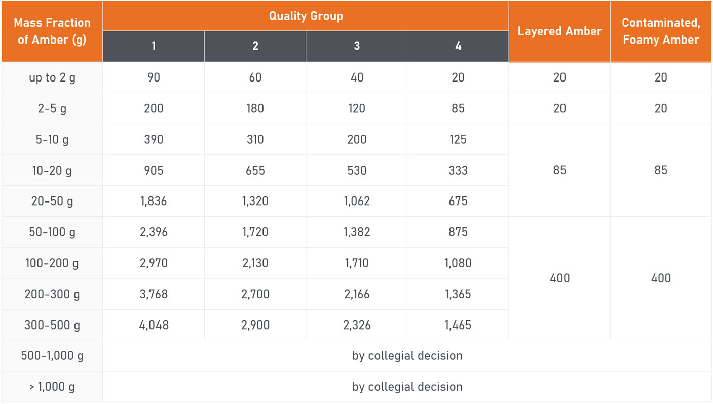 PRICES FOR RAW AMBER ARE PROVIDED IN US DOLLARS PER 1 KILOGRAM, EXCLUDING VAT