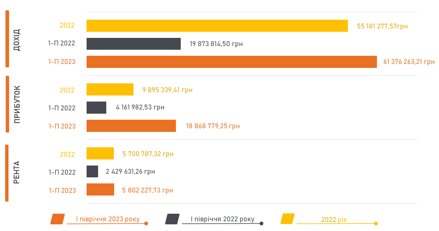 In 2023, ME "Volynpryrodresurs" continued its successful extraction of amber and peat. Accordingly, the financial and economic performance indicators are provided below, including those related to the implementation of the joint activity agreement with LLC "Mineral Extraction" and the agreement with the State Enterprise "Volyntorff."