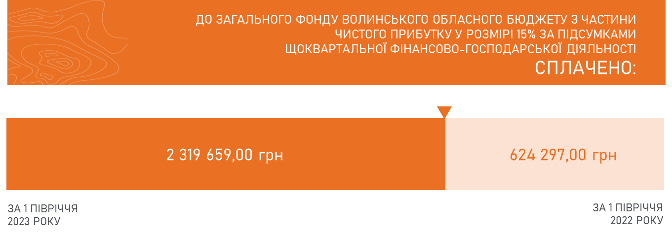 For the first half of 2023, based on quarterly financial and economic performance, 2,319,659.00 UAH was paid to the general fund of the Volyn Regional Budget from a 15% share of net profit. In comparison, for the first half of 2022, 624,297.00 UAH was paid from a 15% share of net profit, indicating significantly higher extraction performance at the start of 2023.