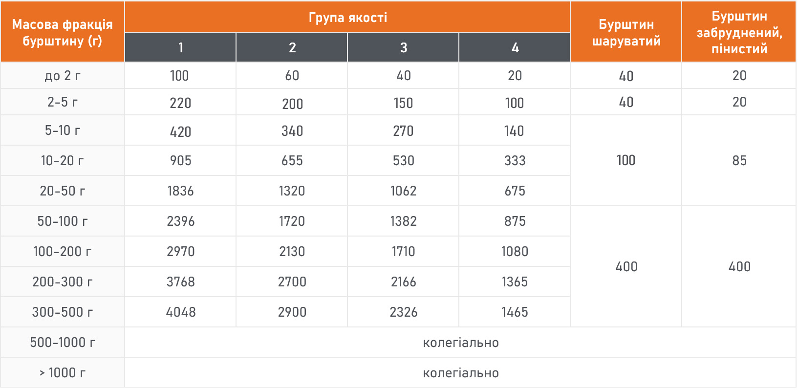 Оціночна вартість бурштину масою більше 500 г встановлюється колегіально за результатами детальної експертизи в Державному гемологічному центрі України.