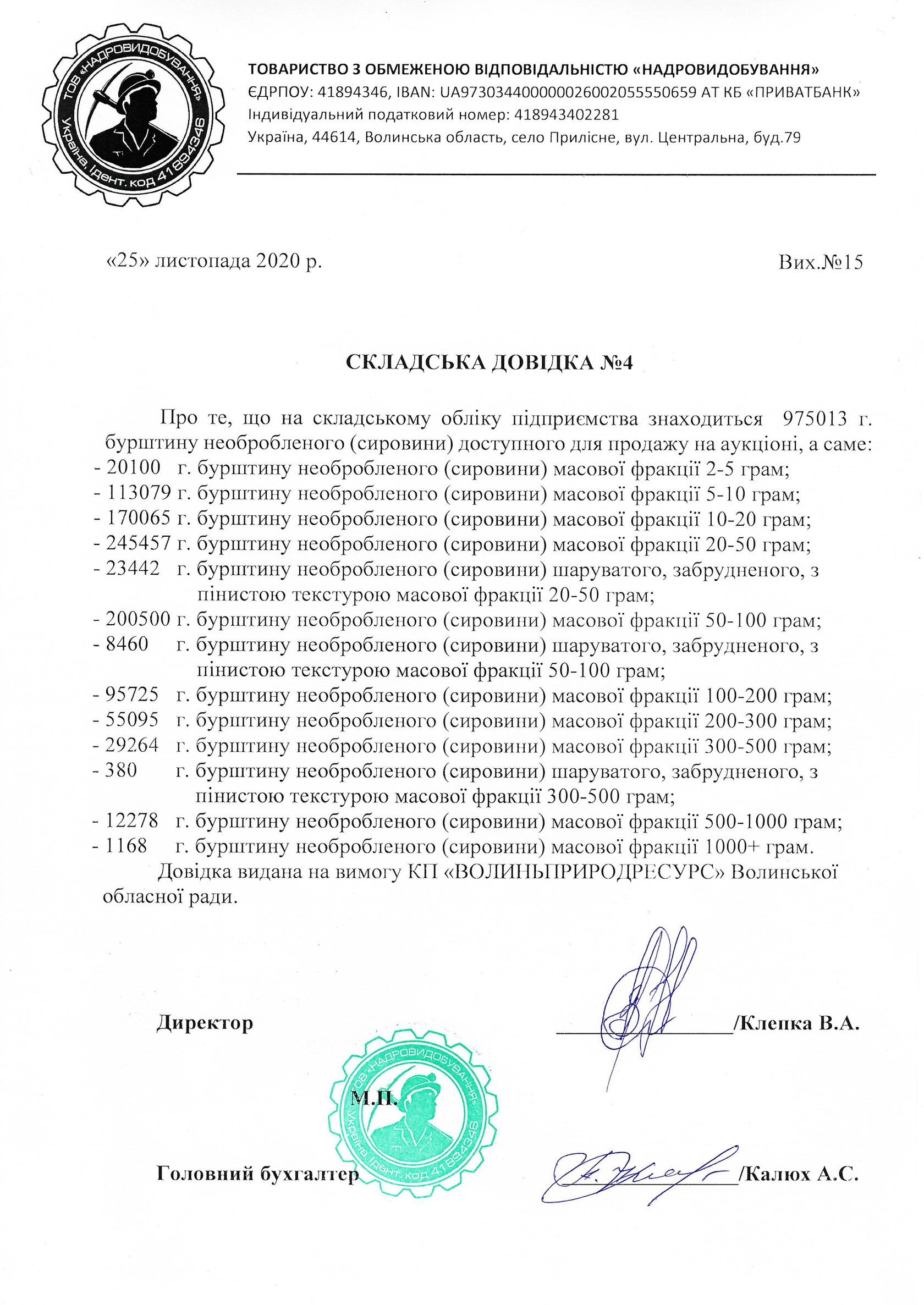 Номінували на аукціон 961567г бурштину, купили 239261г на загальну суму 162978,85$ або 4635000 грн. Залишок 722306г