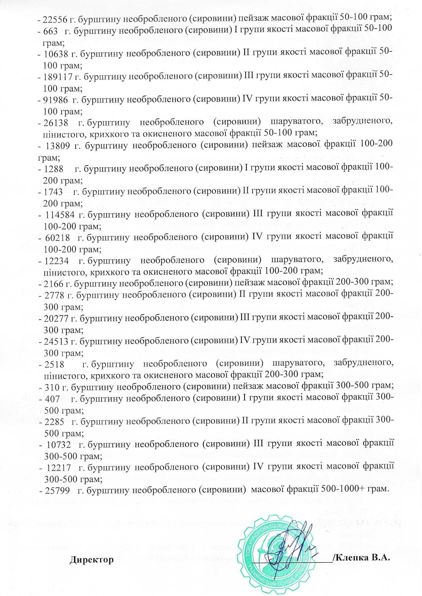 Номінували на аукціон до продажу 1992253г бурштину, купили 334056г на загальну суму 127784,12$ або 3569010,47 грн. Залишок 1658197г.