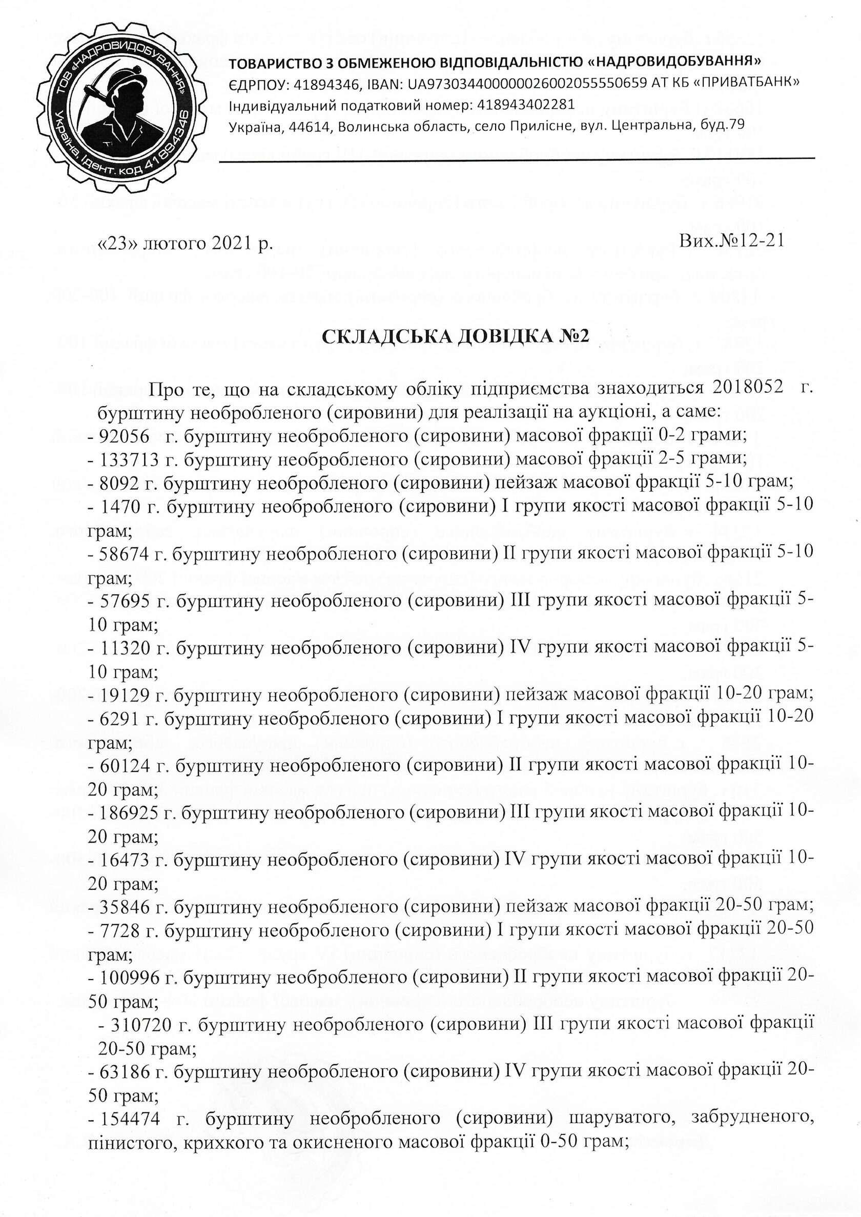 40. Фракція 300-500 (ІІІ-група якості) номінували – 10732г за ціною 2296$/кг без врахування ПДВ, залишок 10732г;
