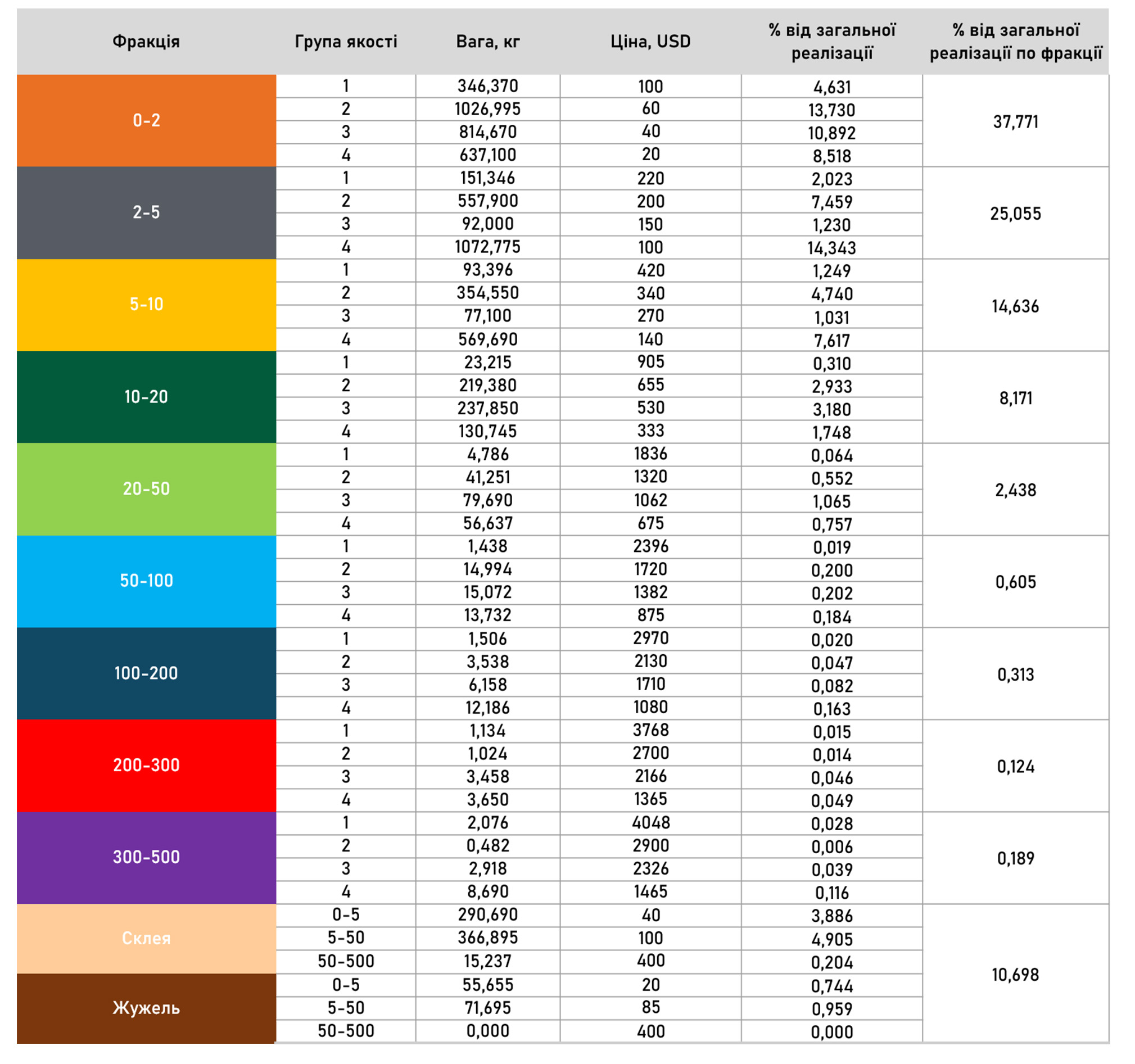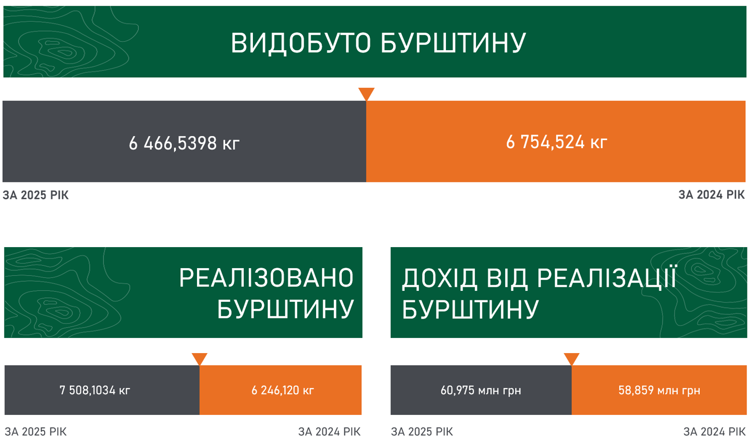 За аналогічний період - 2024 рік - видобуто 6 754,524 кг бурштину різних фракцій та груп якості, реалізовано – 6 246,120 кг на загальну суму 58,859 млн грн. Залишок бурштину на складі станом на 31.12.2024 року становив 1 159,628 кг бурштину.