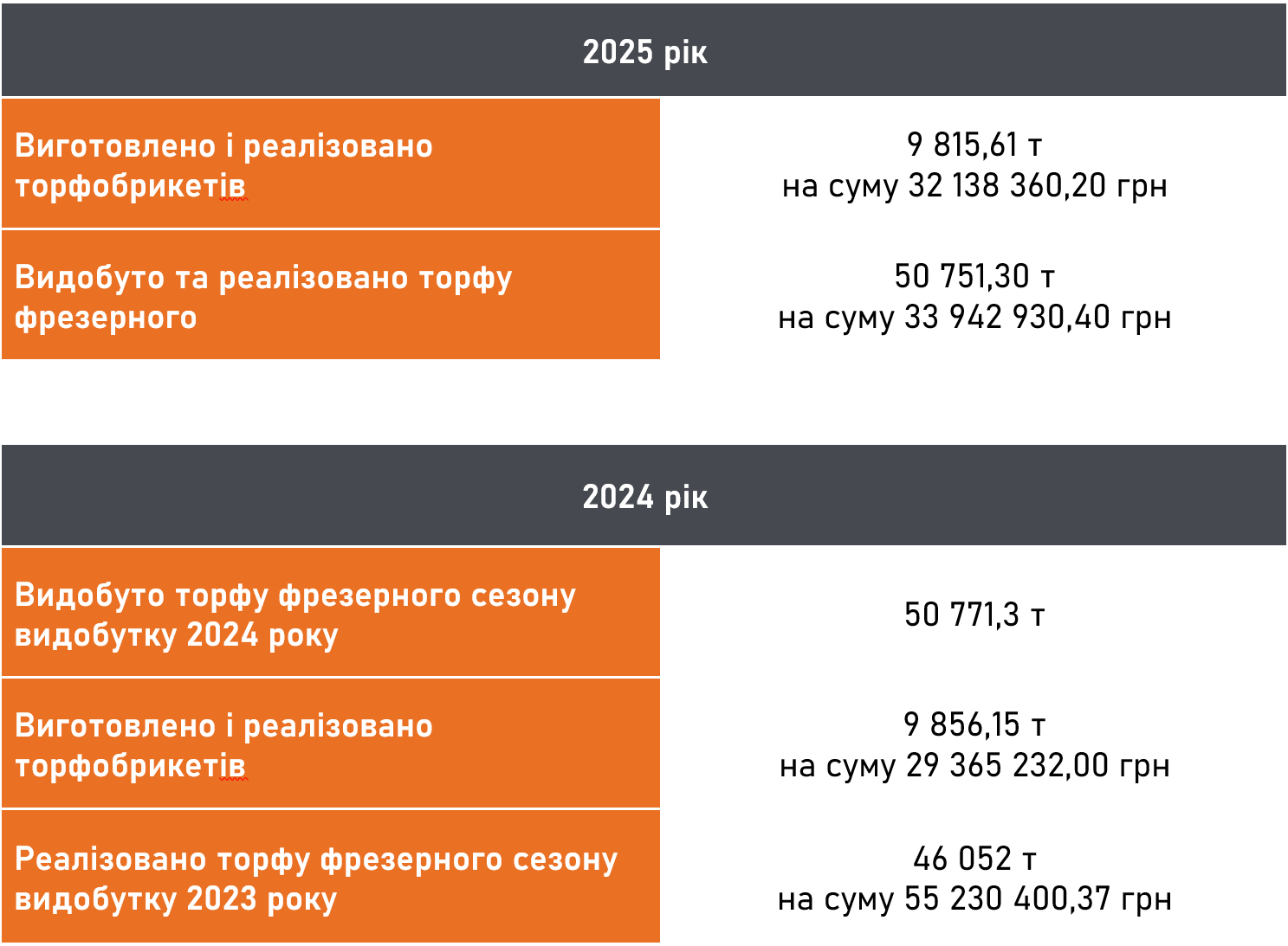 У 2025 році КП «Волиньприродресурс» Волинської обласної ради продовжило успішний видобуток бурштину за рахунок територій, наданих ТГ у зв’язку з неможливістю видобутку на землях лісогосподарського призначення через штучно створені перепони Філією «Поліського лісового офісу» ДП «Ліси України», та продовжило видобуток торфу, показники фінансово-господарської діяльності надаємо у тому числі в розрізі виконання договору спільної діяльності з ТОВ «Надровидобування» та договору з ТОВ «Агробіостандарт» – правонаступники ДП «Волиньторф».