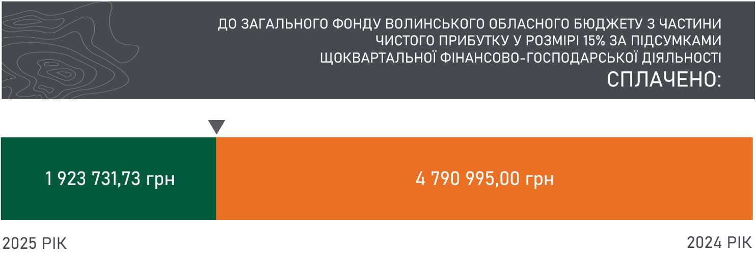 До загального фонду Волинського обласного бюджету з частини чистого прибутку у розмірі 15% за підсумками щоквартальної фінансово-господарської діяльності за 2025 рік сплачено 1 923 731,73 грн. У 2024 році до загального фонду Волинського обласного бюджету з частини чистого прибутку у розмірі 15% сплачено 4 790 995,00 грн.