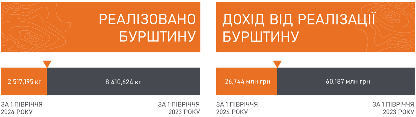 Комунальне підприємство «Волиньприродоресурс» у розрізі виконання договору спільної діяльності з ТОВ «Надровидобування» за І півріччя 2024 року видобуло – 2 130,792 кг бурштину різних фракцій та груп якості, реалізовано – 2 517,195 кг на загальну суму – 26 744 849,71 грн. Залишок бурштину на складі – 264,821 кг.
