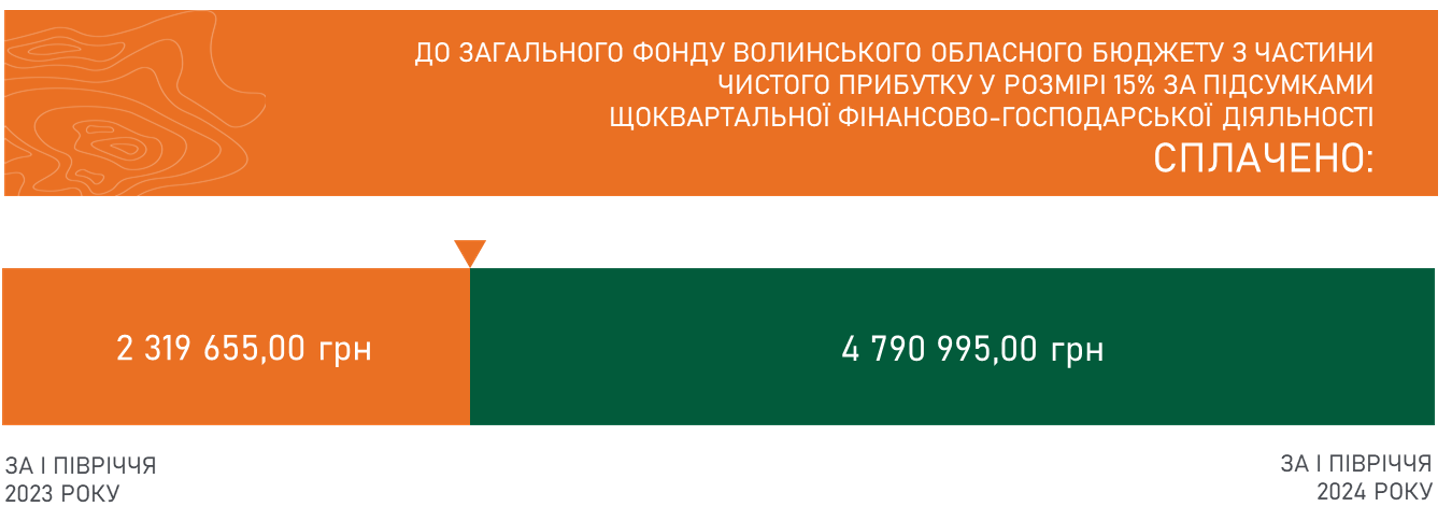 До загального фонду Волинського обласного бюджету з частини чистого прибутку у розмірі 15% за підсумками щоквартальної фінансово-господарської діяльності за І півріччя 2024 року сплачено 4 790 995,00 грн.